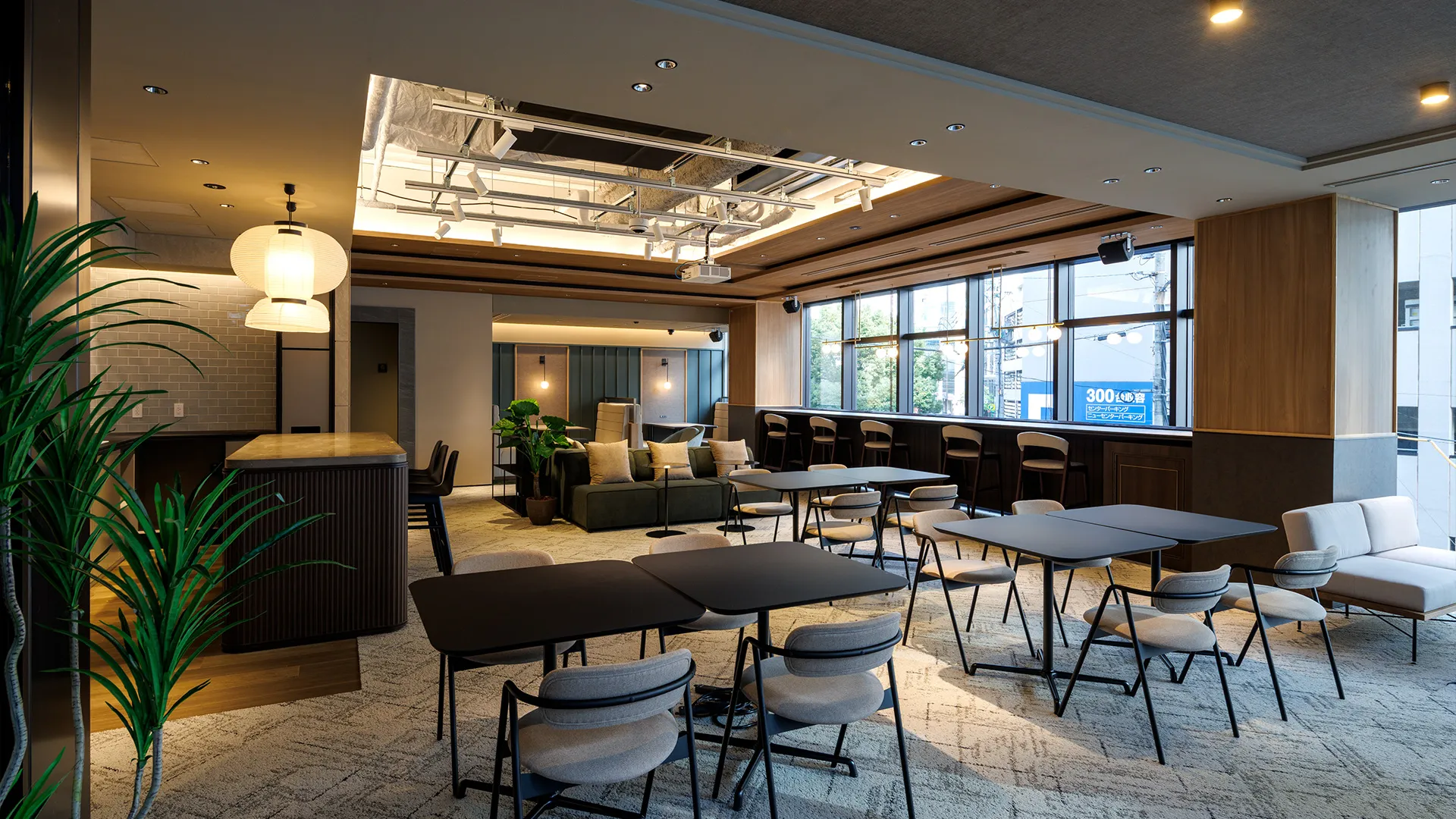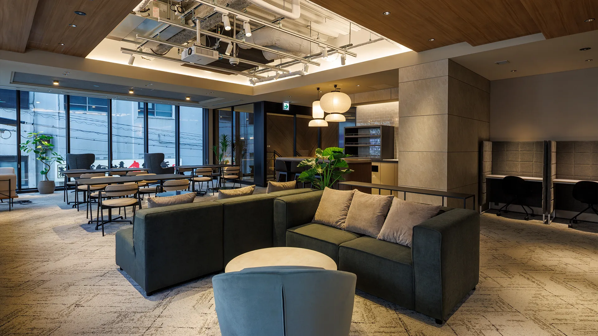 打合せスペース・カウンター・WEBミーティング⽤個室等2階に設けられた共用ラウンジでは、仕事内容に合わせ、⾃由にワークスペースを選択できます。