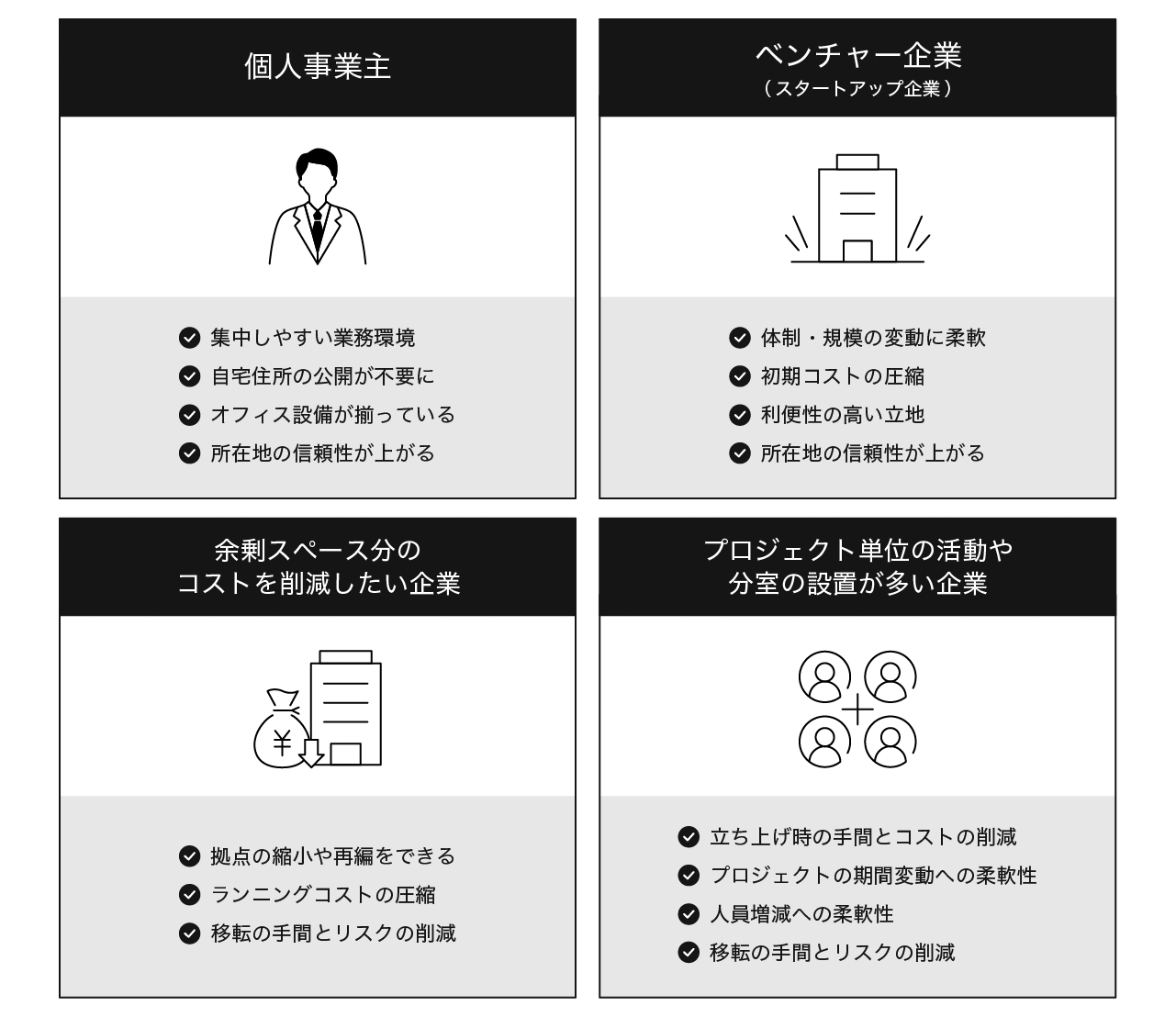 レンタルオフィスは、特に個人事業主やベンチャー企業(スタートアップ)に向いてるといえます。