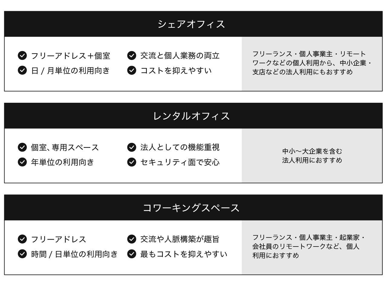 したがって、どちらを利用するか迷った際は、「専用スペースが必要かどうか」で検討するとともに、名称にとらわれず具体的なサービス内容を事前確認することが重要です。